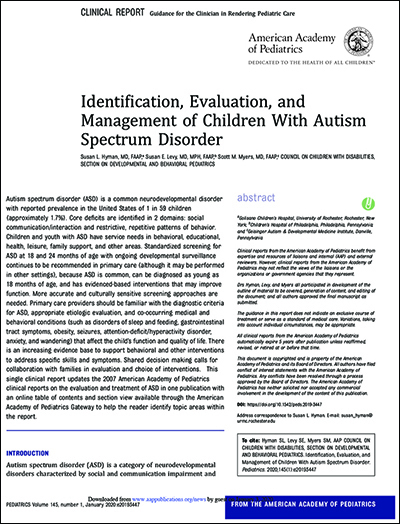 Pediatrics, the official journal of the American Academy of Pediatrics (AAP) has published a new clinical report on the evaluation and treatment of autism spectrum disorder for clinicians in pediatric care. This report, Identification, Evaluation, and Management of Children With Autism Spectrum Disorder (PDF), updates the 2007 American Academy of Pediatrics publication. It provides an online table of contents and section view available through the American Academy of Pediatrics Gateway to help the reader identify topic areas within the report.
