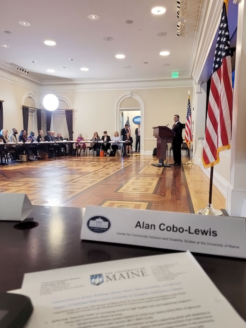 On March 14, 2024, Alan Cobo-Lewis, associate professor of psychology and director of the Center for Community Inclusion and Disability Studies (CCIDS), Maine’s University Center for Excellence in Developmental Disabilities or UCEDD, was invited to attend Communities in Action: Building a Better Maine, New Hampshire, and Vermont, in person at the White House complex. This meeting brought together federal figures with over three dozen local elected officials and community leaders working on behalf of their communities to create opportunities and improve people’s everyday lives. Discussions highlighted federal initiatives, especially those funded by the American Recovery Plan Act (ARPA), Inflation Reduction Act, and Bipartisan Infrastructure Investment and Jobs Act.