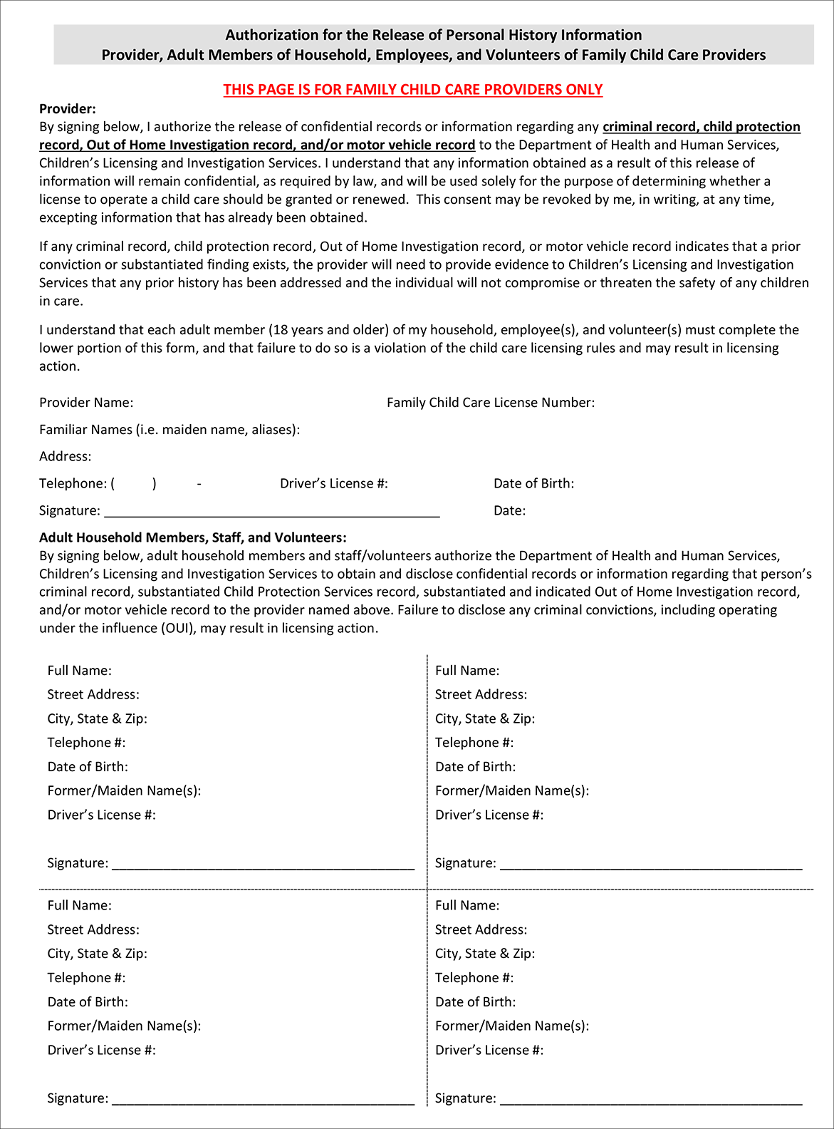 - You should also include the Authorization for Release of Personal History Information (listed on the back of the application, depicted below) with your application.